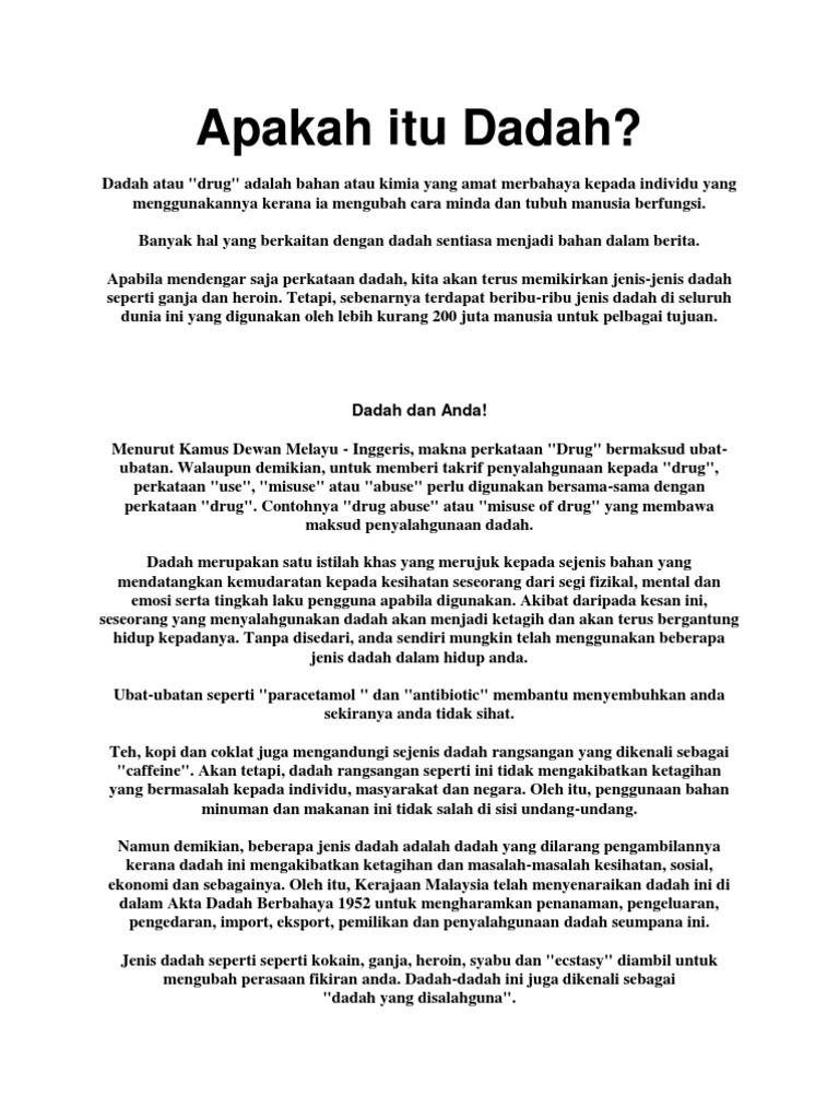Dadah atau drug adalah bahan atau kimia yang amat merbahaya kepada individu yang menggunakannya kerana ia mengubah cara minda dan tubuh manusia berfungsi.